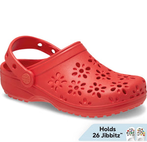 Crocs Classic Floral Cut-Out Clog Cherry Red - The classic clog from Crocs is made from their durable Croslite material. It is lightweight and easy to clean. The classic clog features ventilation holes, which can also accommodate Jibbitz charms. There is a pivoting heel strap for a secure fit.