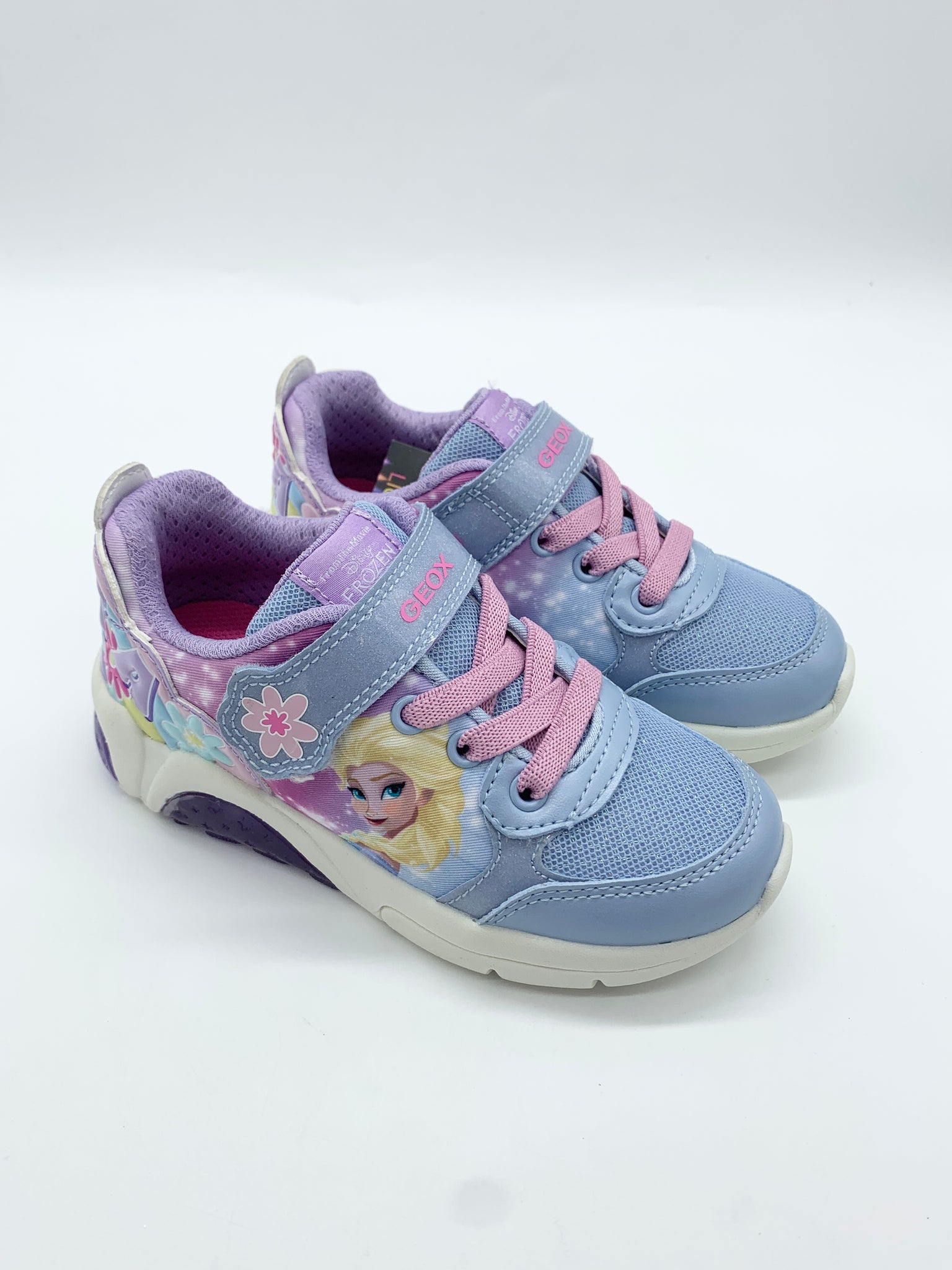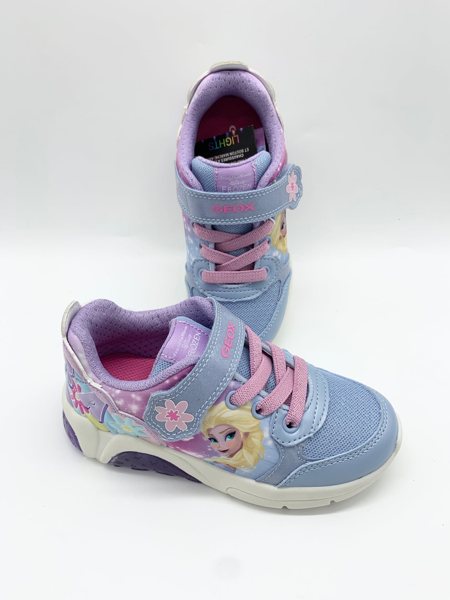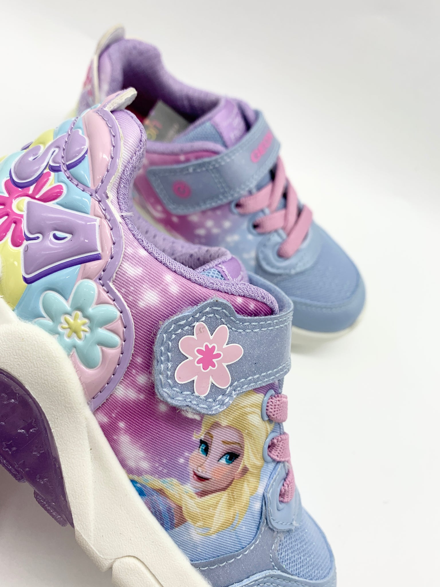 Geox Fadinlight Elsa Frozen Trainer Lilac/Sky Blue J65M4C0AN02C8RM4 -This trainer comes in gorgeous lilac & sky blue shades.It features lights in the sole unit and they have an on/off switch. Robust hard wearing sole. Fastens with single velcro strap.Elasticated lace. Features Geox breathable footbed.