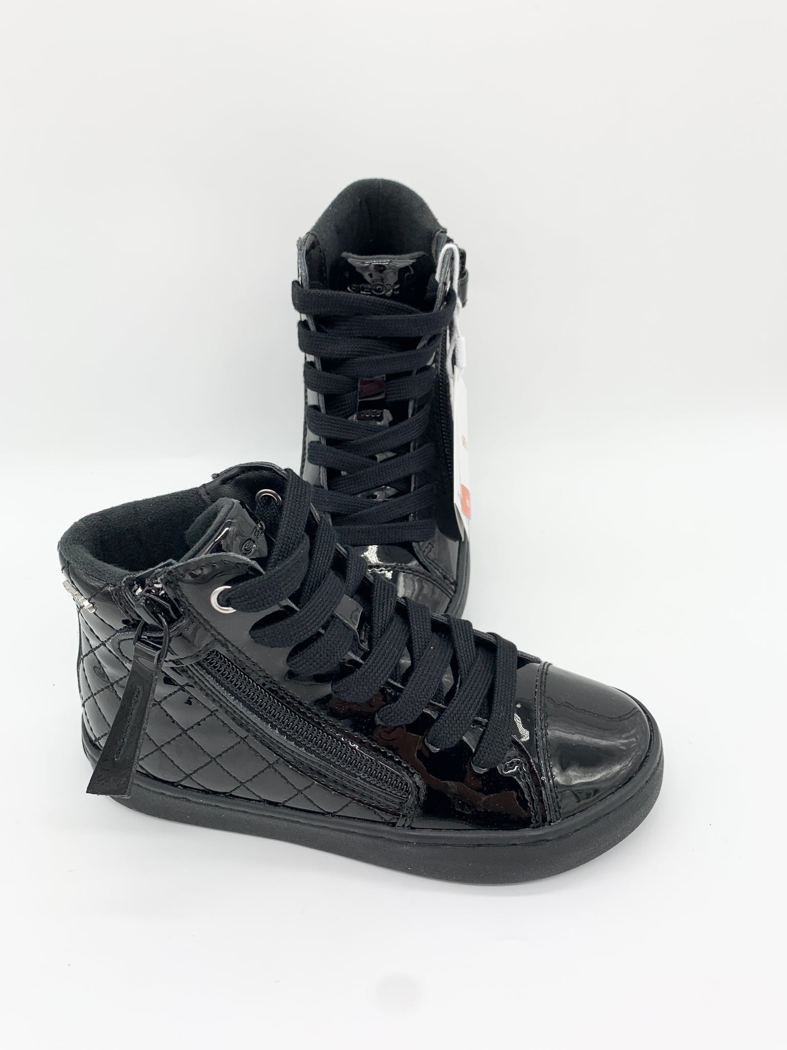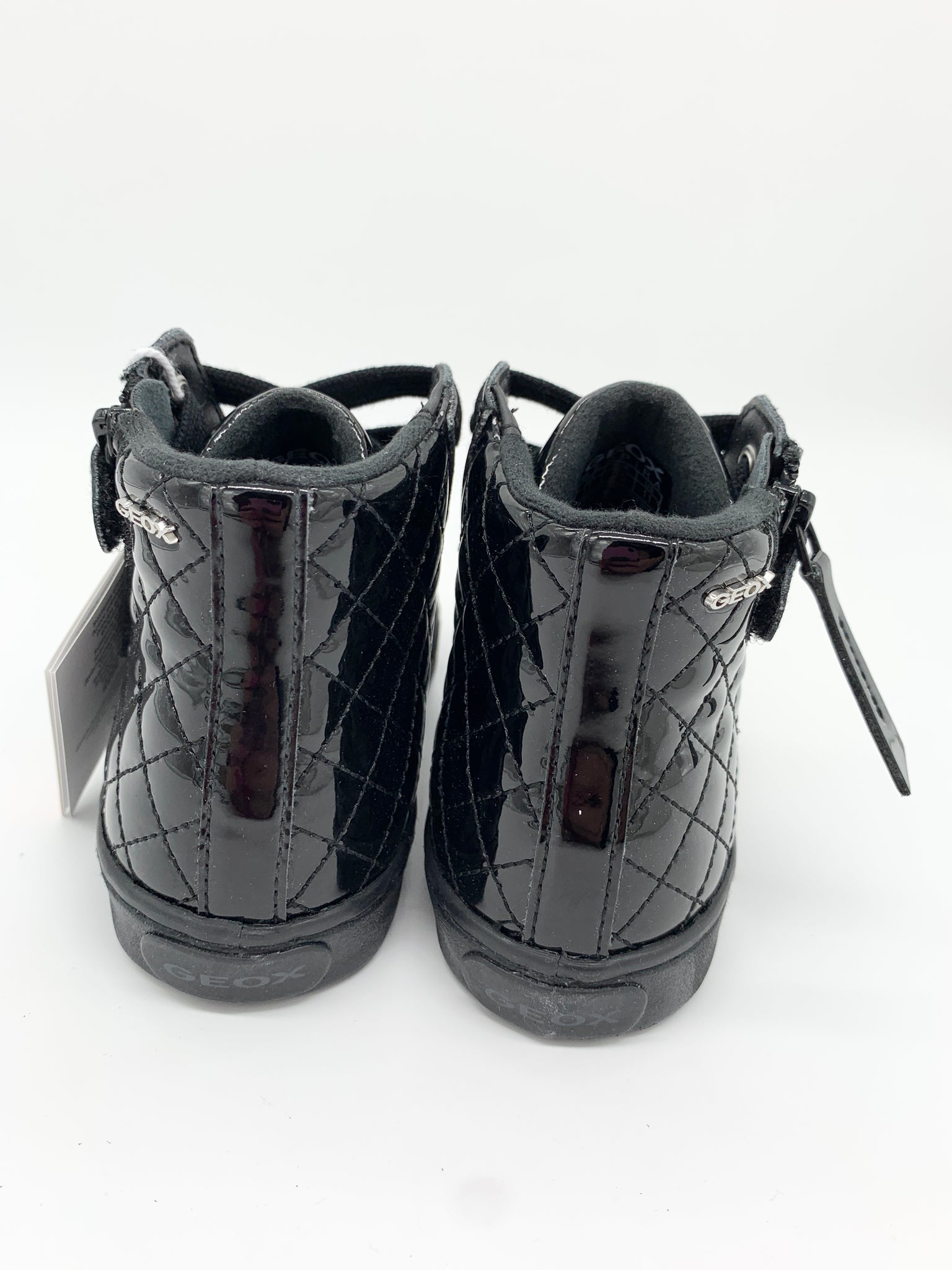 Geox Kalispera Hi-Top Black - This hi-top trainer features the Geox breathable footbed with leather insole. Elasticated lace, velcro strap and side zip for easy on/off.  Comes in this shiny patent look. Side zip for easy on/off. School Shoes.