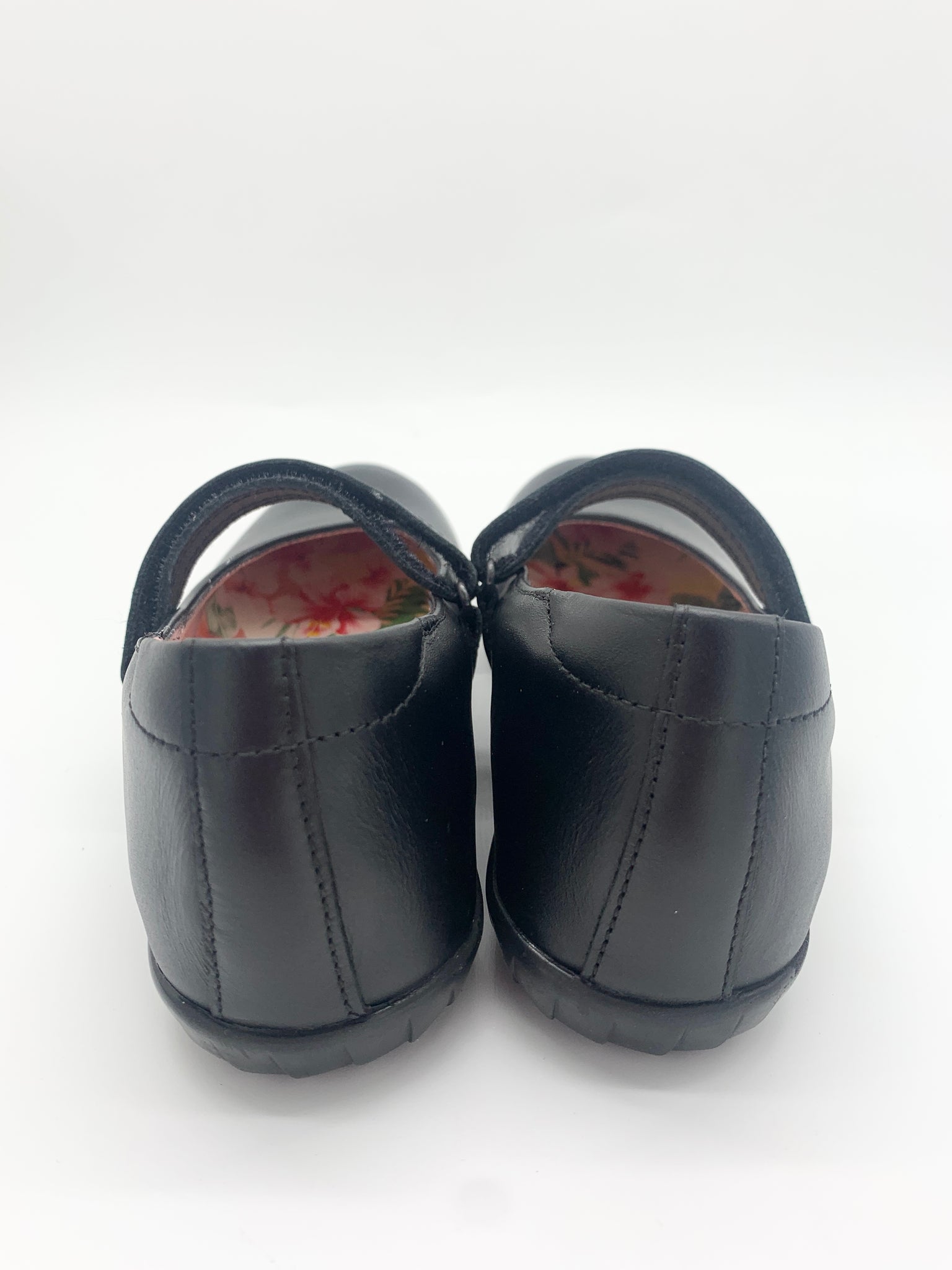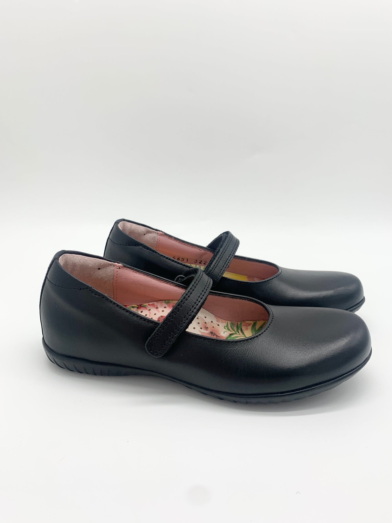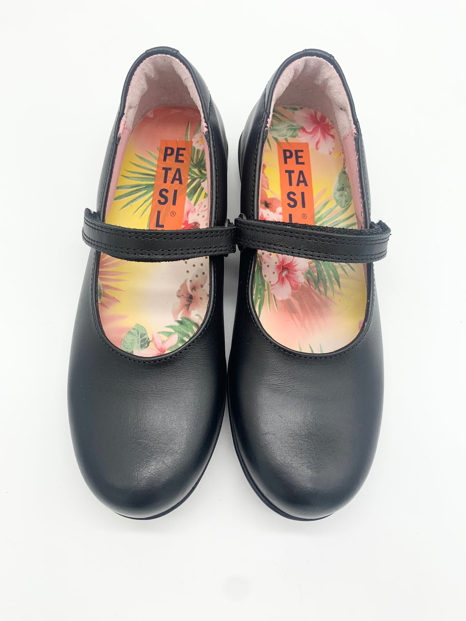 Petasil Evie 2 Mary Jane Black Leather D - Suitable for slim feet. Classic leather mary jane shoe. Velcro strap. Built in arch support and pretty flower detail on the insole. Robust rubber non-slip sole. D width fitting. School Shoe.