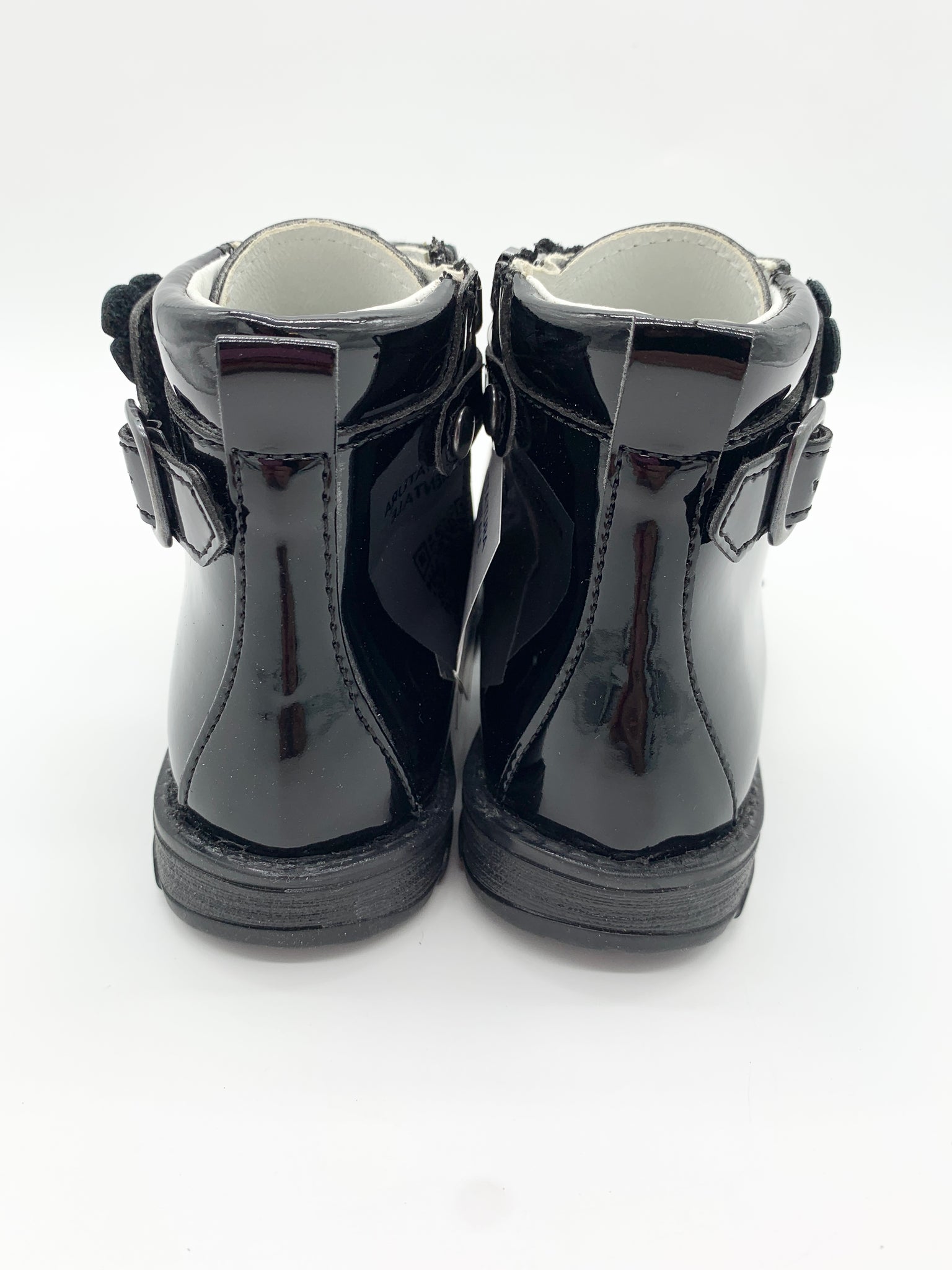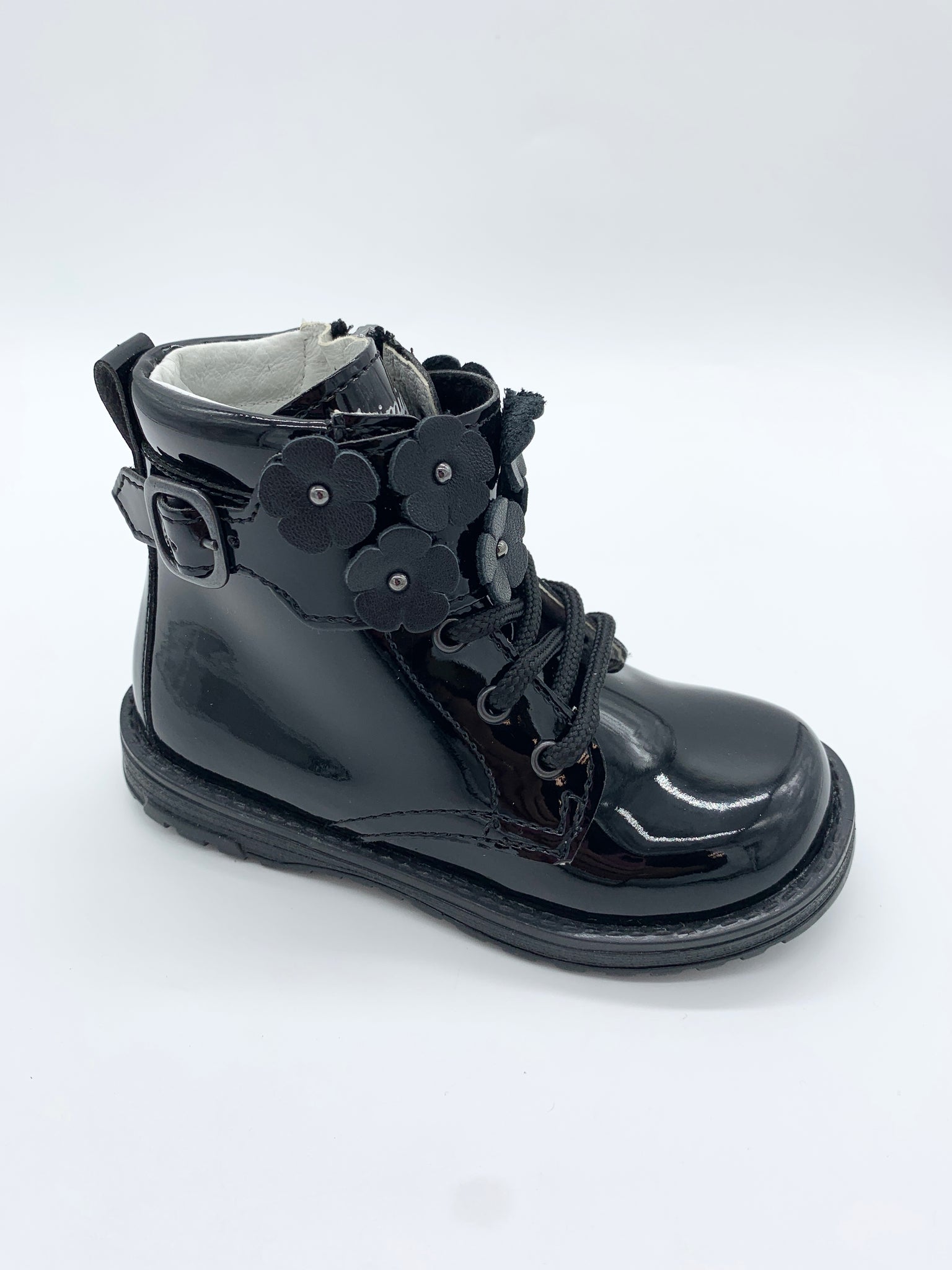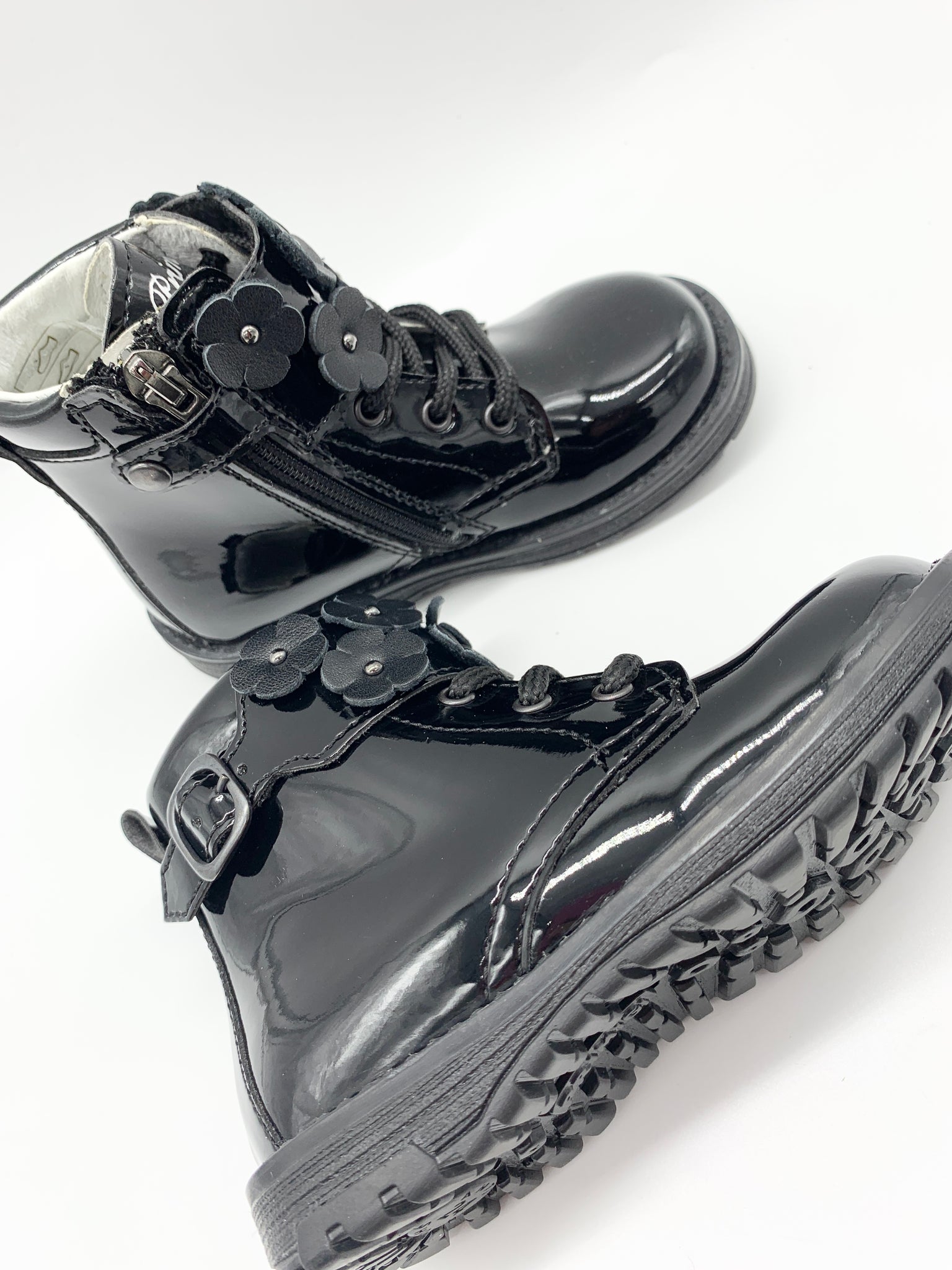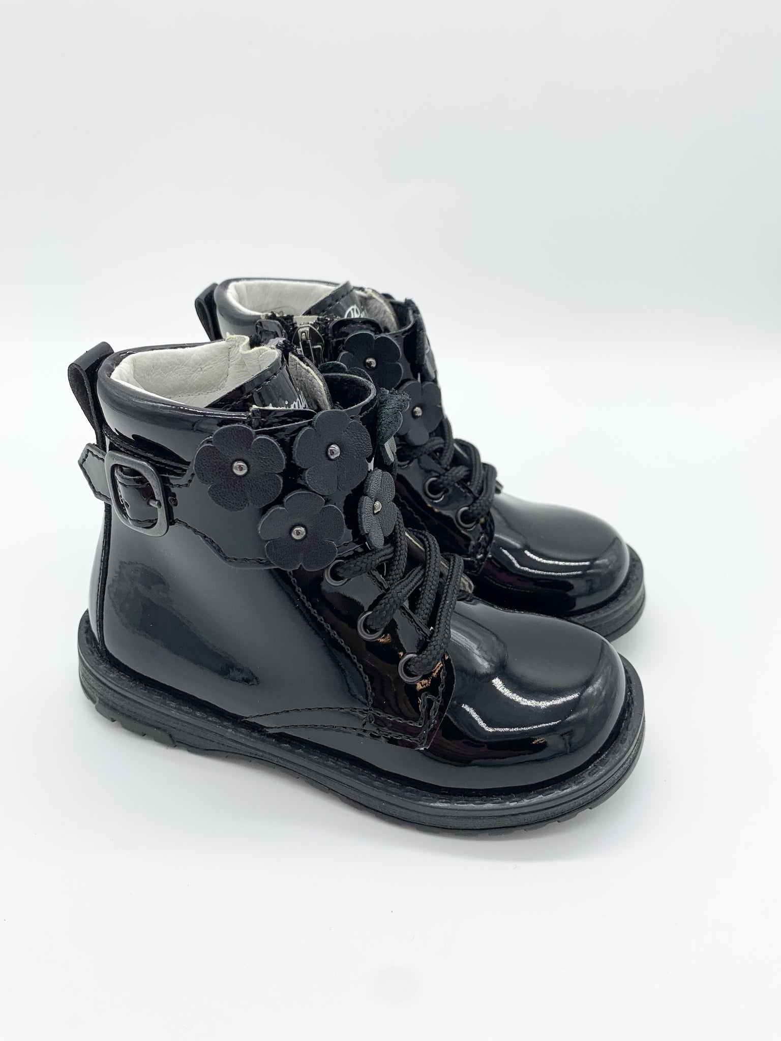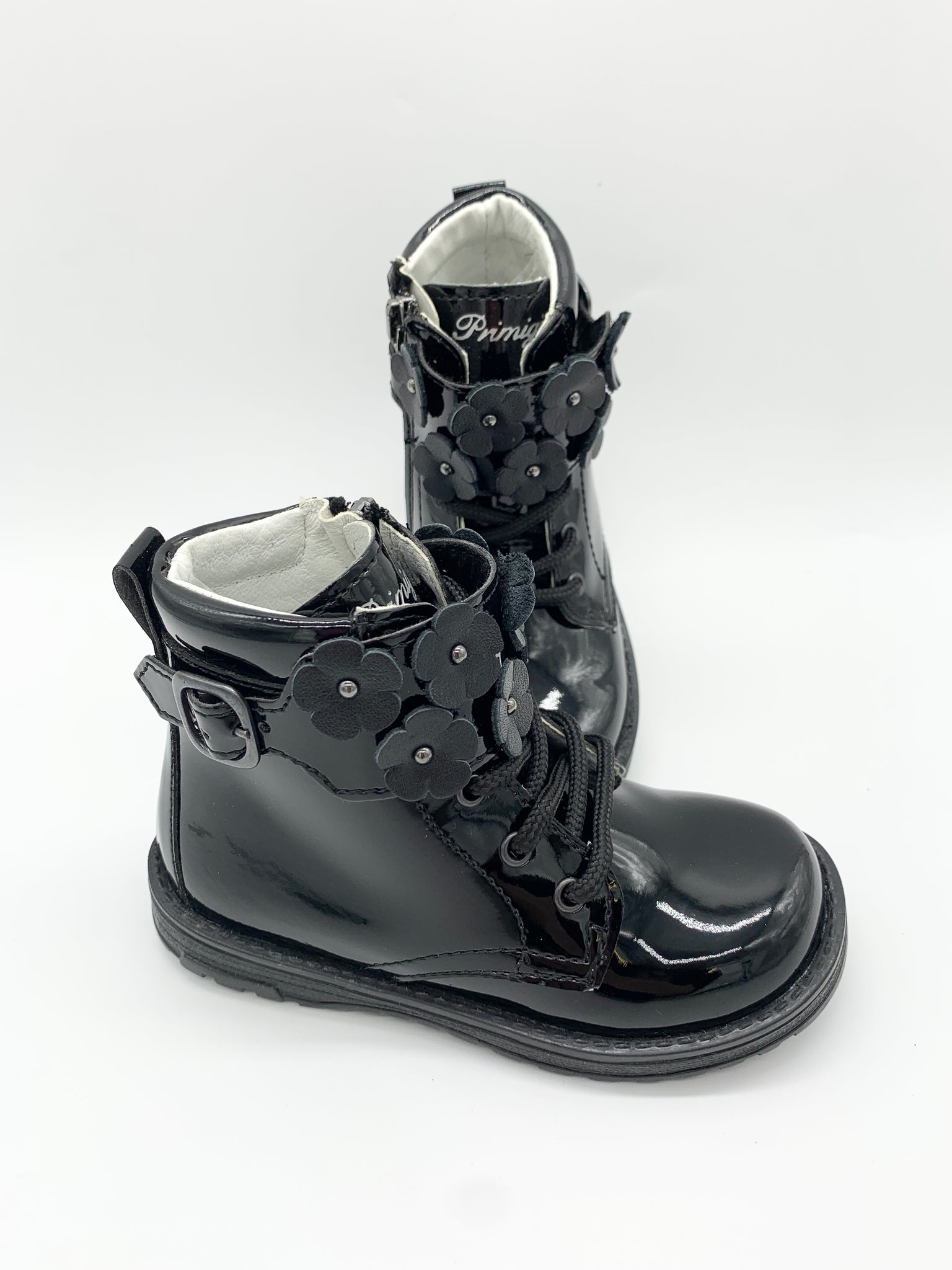 Primigi Play Ankle Boot in Black 8913611 or Silver 8913622 - Lace up with side zip for easy on/off. Beautiful floral detail across the ankle. Leather upper, lining and insole. Non slip rubber sole with flexible toe area. The prefect junior ankle boot. Comes is black patent or silver.